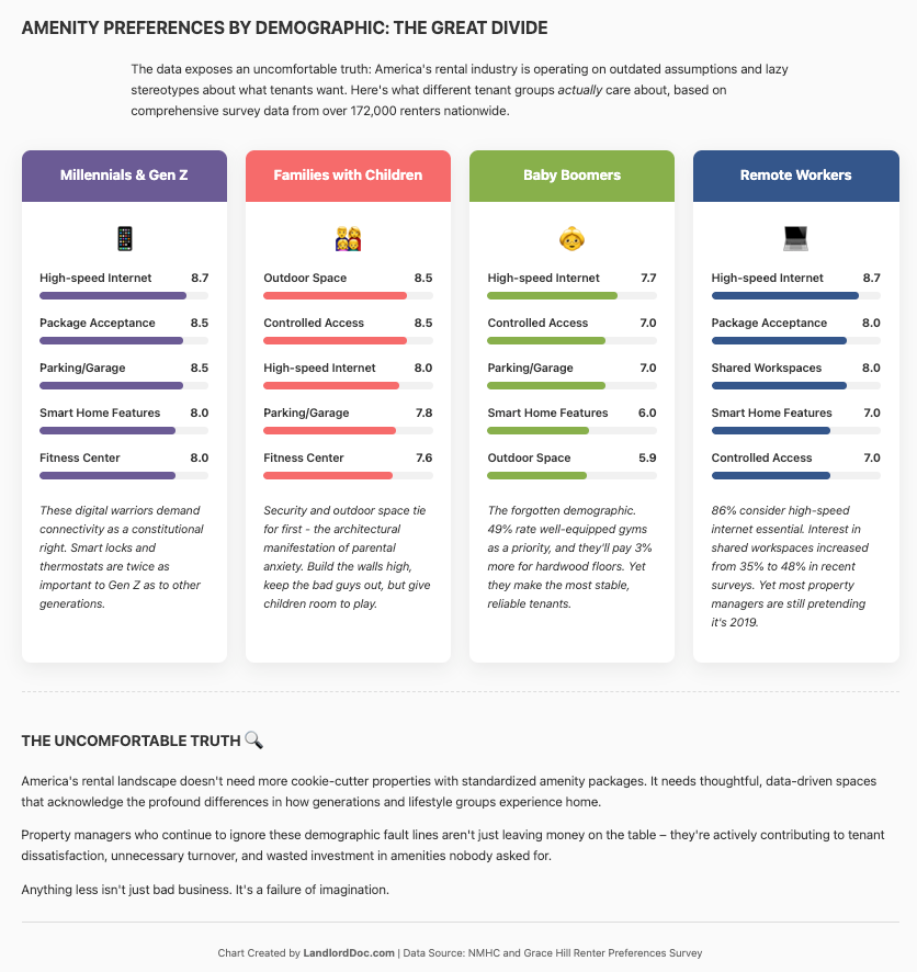 Property managers who continue to ignore these demographic fault lines aren't just leaving money on the table β they're actively contributing to tenant dissatisfaction, unnecessary turnover, and wasted investment in amenities nobody asked for.